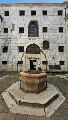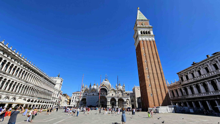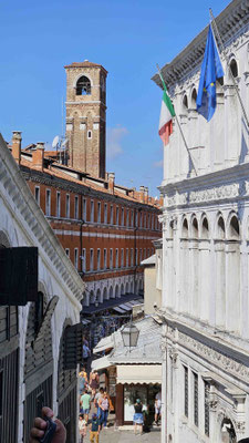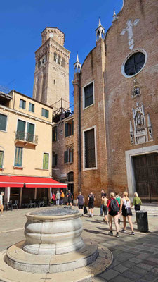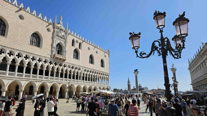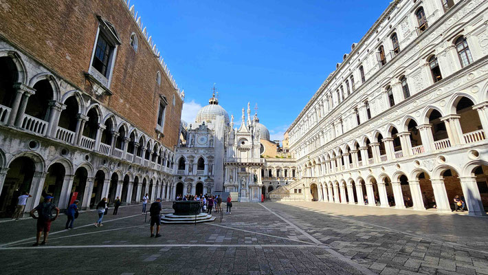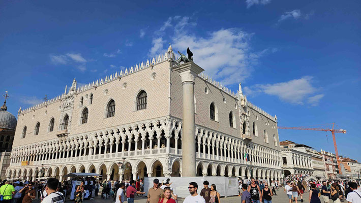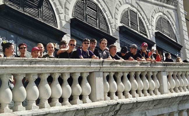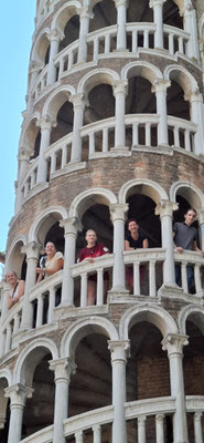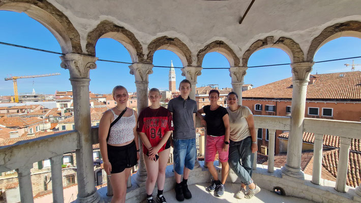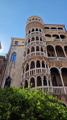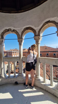 Am Markusplatz wollten viele auf den Markusturm, doch wie schon beim Flixbus gab es auch hier… Überraschung: Probleme! Unmöglich ein Ticket zu buchen, außer man hat 3 Stunden Zeit! Also strichen wir ihn einfach von unserer Liste. Plan B: Gruppenaufteilung. Während die einen sich im Dogenpalast die Zeit vertrieben und die Seufzerbrücke anschauten, gingen die anderen zum Schneckenturm „Scala Contarini del Bovolo“ – der Name allein rechtfertigte eigentlich schon den Aufstieg.