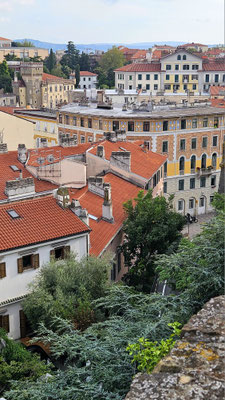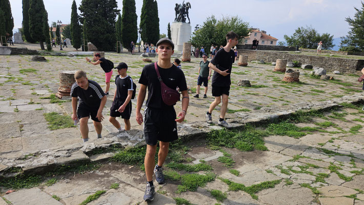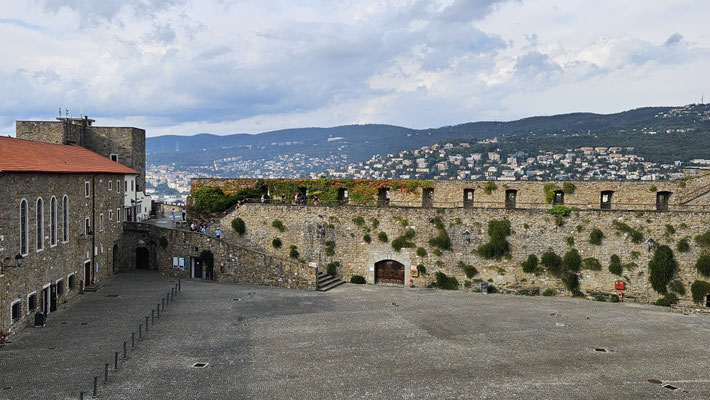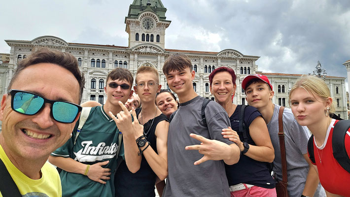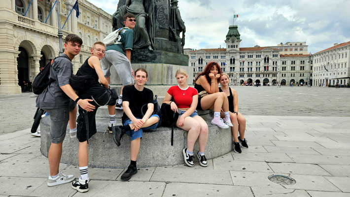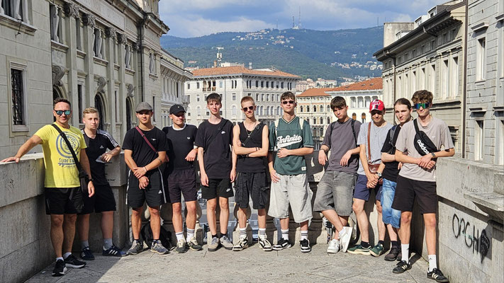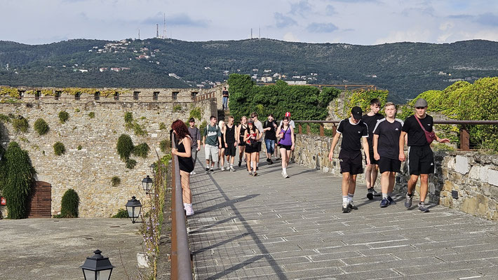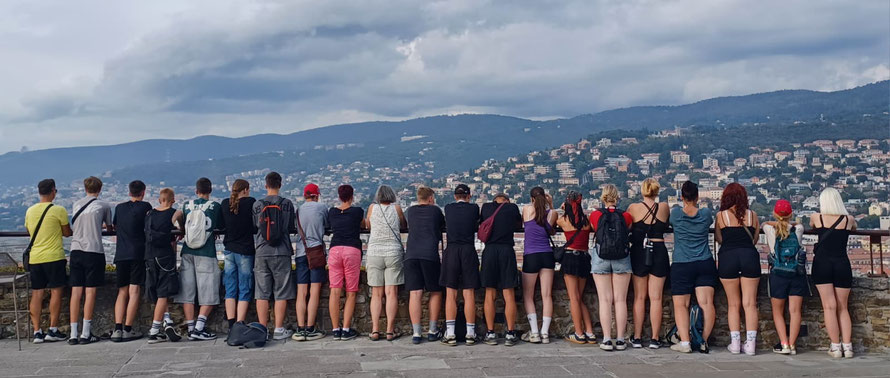 Von dort aus weiter zum Castello di San Giusto. Endlich mal ein Ort, an dem man wirklich Pause machen konnte: Aussicht über die gesamte Stadt, die Adria und wenn man den Augen traute, sogar bis Slowenien. Ein perfekter Moment für das obligatorische Klassenfoto, bei dem jeder so tat, als hätte er nicht gerade 200 Stufen hinter sich.
