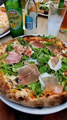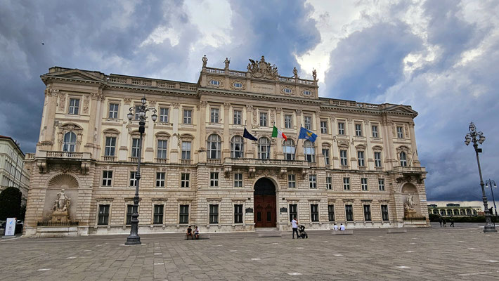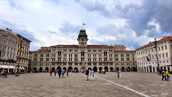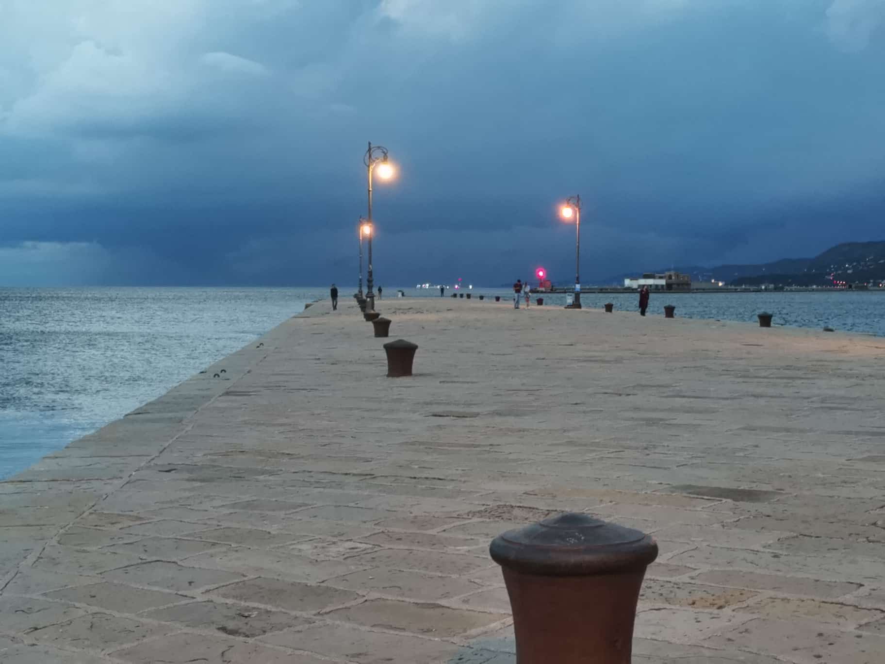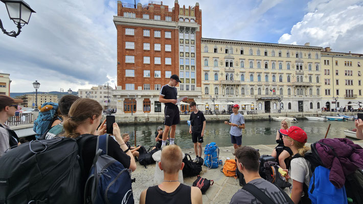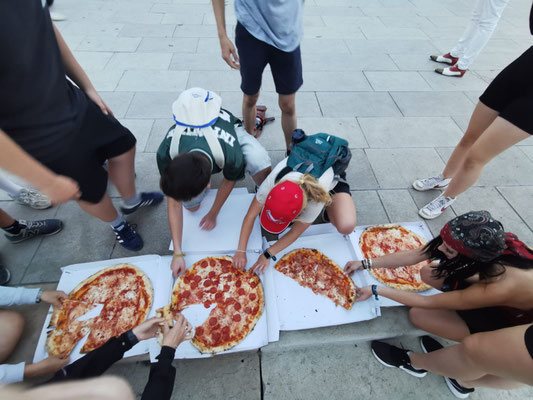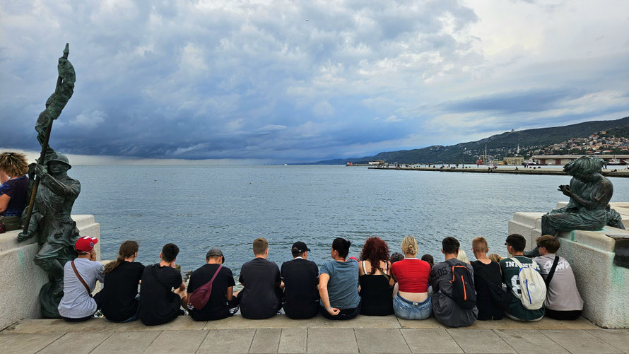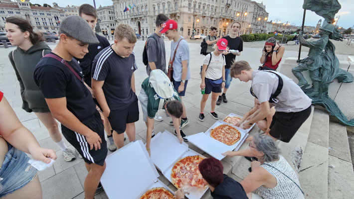 Anschließend erreichten wir die Piazza Unità d’Italia – mit Blick aufs Meer, wo wir die nächste Meisterleistung planten. Aus verschiedenen Gründen konnte der gemeinsame Kochabend nicht stattfinden und das für heute eingeteilte Team wurde losgeschickt. Hierbei mussten einige Unstimmigkeiten in der Gruppe überwunden werden und am Ende saßen wir tatsächlich mit Pizza auf den Treppen am Meer – romantisch, wenn da nicht das Gewitter gewesen wäre, das mit dramatischem Himmel und der Bora-Windmaschine deluxe auf uns zu kam.