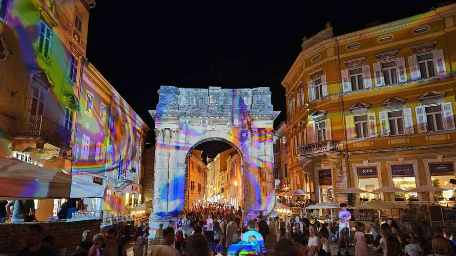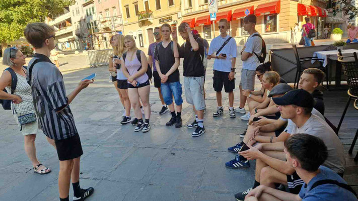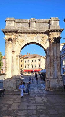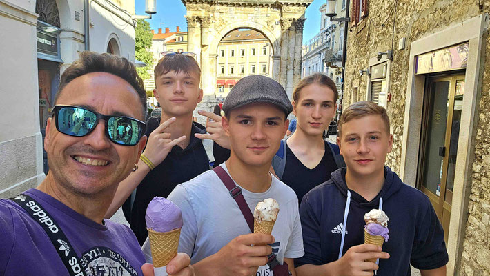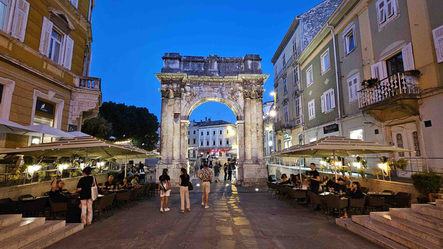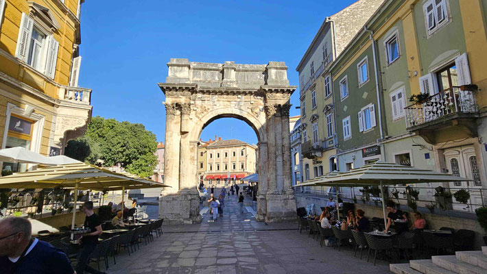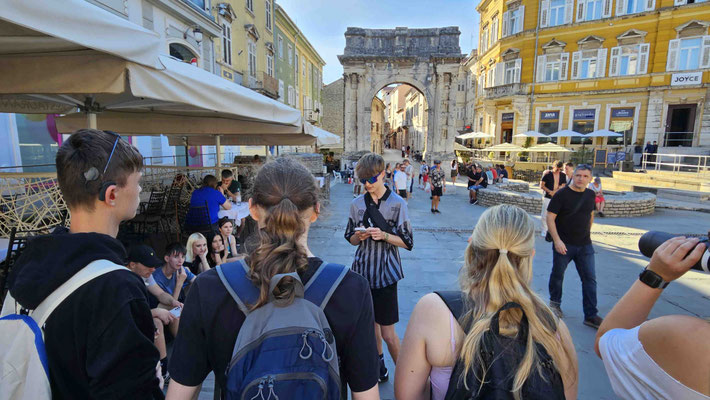 Dann startete die Stadttour durch Pula. Erste Station: der große römische Sergierbogen. Noah, unser Reiseleiter, lieferte dazu einen Vortrag mit der Ernsthaftigkeit eines Geschichtsprofessors und der Begeisterung eines Studenten am letzten Seminartag. Man konnte sich fast vorstellen, dass die Steine selbst applaudierten – oder zumindest wir innerlich.