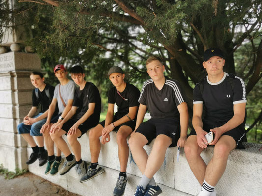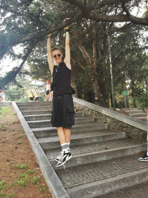 Nächster Stopp: die Scala dei Giganti. Der Name versprach bereits, was uns erwartete – endlos viele Treppen. Spätestens nach der Hälfte hatten wir alle verstanden, warum die „Giganten“ hier vermutlich ausgestorben sind: Die mussten sich nämlich jeden Tag da hochquälen. Oben angekommen, gab’s natürlich ein Gruppenfoto – einmal Jungs, einmal Mädchen, damit jeder sein eigenes Instagram-Material hat. Zur Belohnung wartete dann noch ein Spielplatz, auf dem sich die letzten Energiereserven in Klettergeräten verflüchtigten.