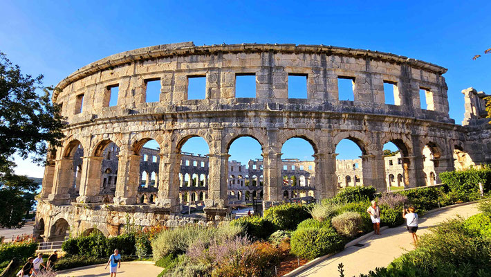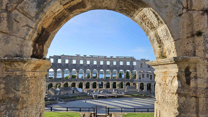 Kaum hatten wir die Perspektive ausreichend bewundert, führte der Weg weiter zum Amphitheater. Gladiatoren-Feeling light, Selfies inklusive, nur ohne blutige Details.