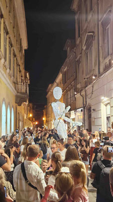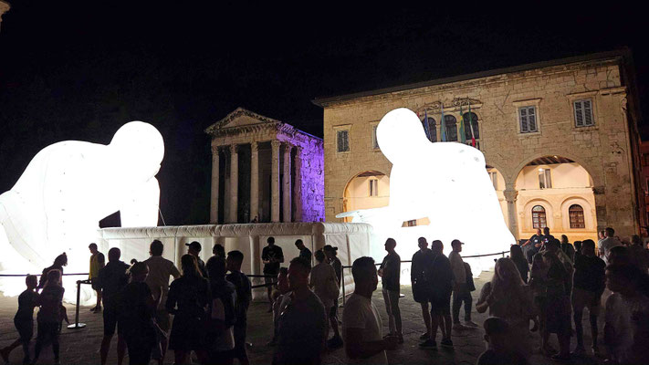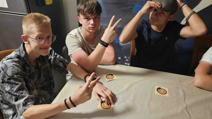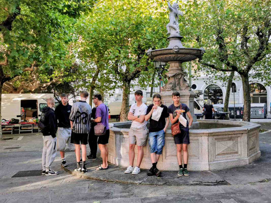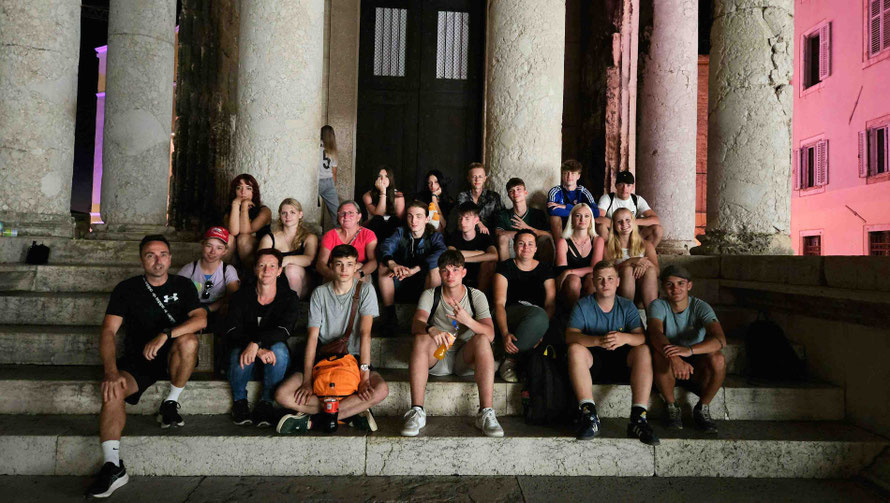 Um 20 Uhr war Treffpunkt zum Gruppenfoto am Augustus-Tempel in der Altstadt. Bevor es gemeinsam zurück ins Hostel ging, bewunderten wir noch stimmungsvolle Lichtinstallationen und musikalische Begleitung – fast schon romantisch, wenn nicht alle so müde gewesen wären. Im Hostel selbst folgte der letzte offizielle Programmpunkt des Tages: ein gemeinsamer Spieleabend in der Küche, natürlich auch mit Wehrwolf! Wie Dennis und Luca vorhergesagt hatten, fielen danach alle ins Bett und „schliefen wie Engel“.