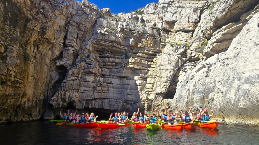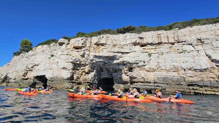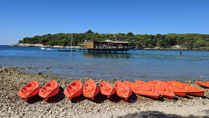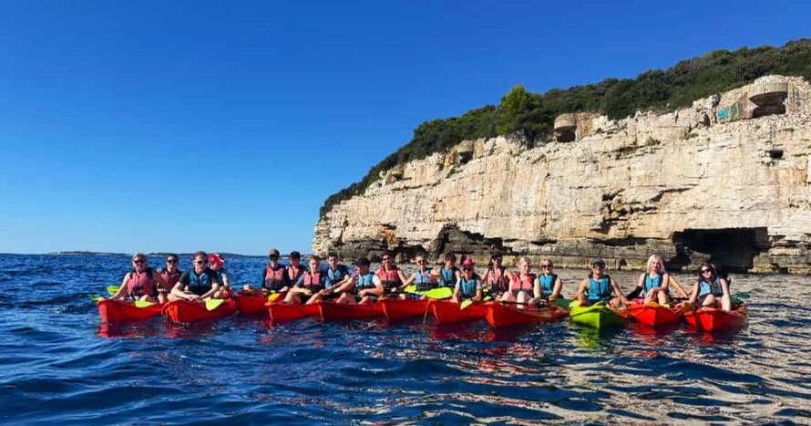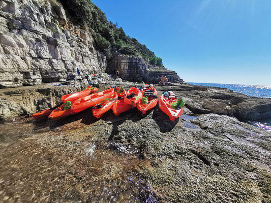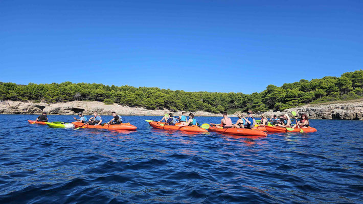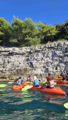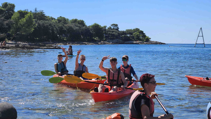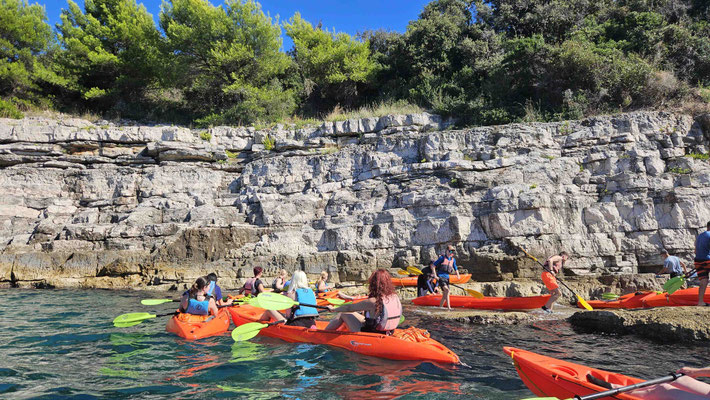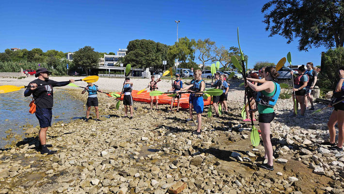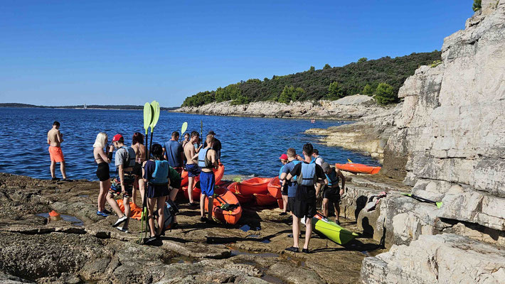 Der Kajakverleih selbst war gar nicht so einfach zu finden. Doch zum Glück tauchten unsere Guides Dennis und Luca nach einem kurzen Telefonat auf und ersparten uns eine Schnitzeljagd durch halb Pula. Während einige noch in Badesachen wechselten, wurden die Kajaks abgeladen und alles für unser Abenteuer vorbereitet.