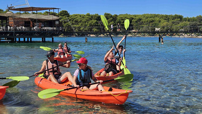 Die ersten Paddelschläge im Meer waren dann eine Wissenschaft für sich. Da wir in Zweierteams unterwegs waren, hing das Schicksal der Fahrt oft davon ab, ob der Hintermann verstanden hatte, wie der Vordermann paddelt. Spoiler: Nicht immer. Manche bekamen noch gut gemeinte Tipps („zieh gleichmäßig, nicht wie ein Rasenmäher“), manche nahmen sie sogar an, andere machten lieber ihr eigenes Ding und gondelten im Zickzack durch die Adria.