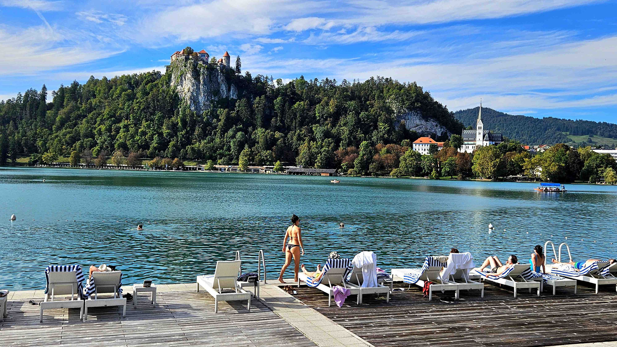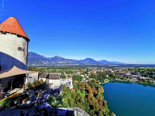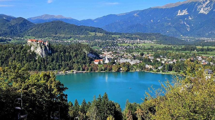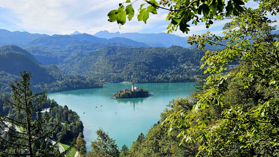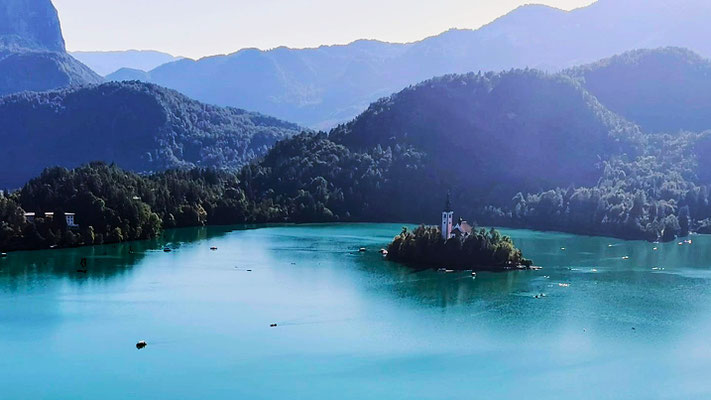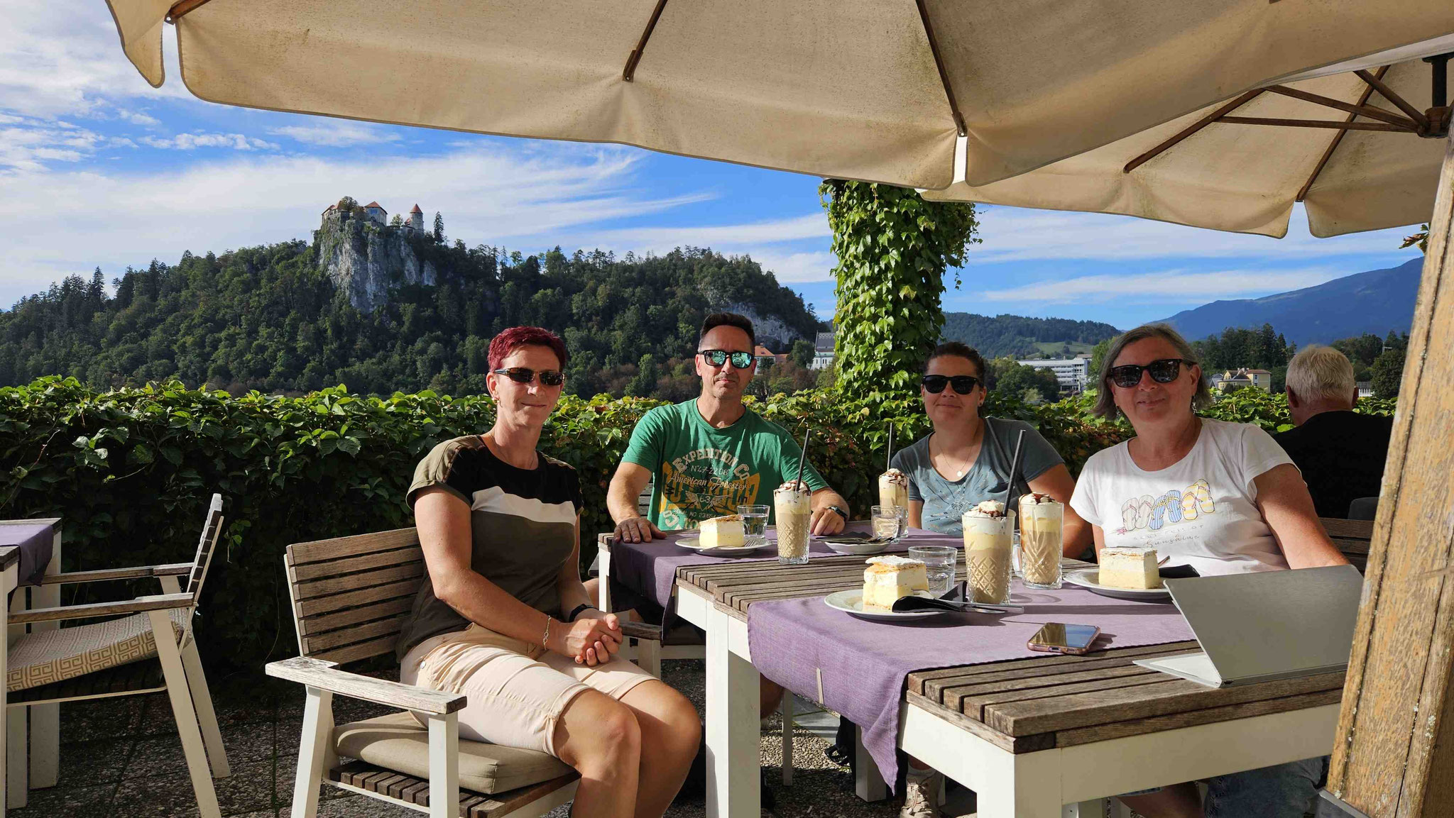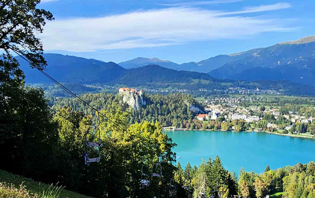 Programm- und Logistikteam liefen inzwischen zur Höchstform auf und führten uns wie eine gut geölte Reisegruppe zum nächsten Highlight: der Sommerrodelbahn von Bled, 140 Meter oberhalb des Sees. Kurz blitzte die Horrorvorstellung auf, wir müssten diesen Anstieg zu Fuß bewältigen – aber zum Glück gab es einen Sessellift. Im Doppelsitz schwebten wir hinauf, mit Panorama deluxe: der See glitzerte, die Burg thronte, und die Kirche „Mariä-Himmelfahrt“ mitten im Wasser sah aus wie direkt aus einem Slowenien-Werbeprospekt ausgeschnitten.