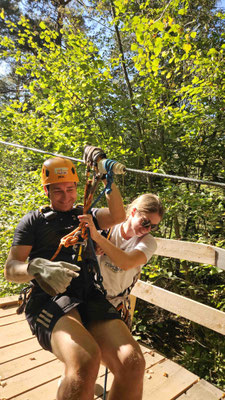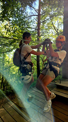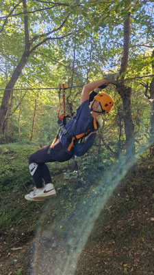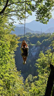 Währenddessen stürzte sich das Zipline-Team in luftige Abenteuer. Europas längste Zipline stand auf dem Programm – über 4 Kilometer geballtes „Ich-schrei-meine-Lunge-raus“. Zuerst gab’s das volle Sicherheitsprogramm: Gurt anlegen, Karabiner einklicken, Helm aufsetzen – kurz fühlte man sich mehr wie Astronaut auf dem Weg ins All als wie Schüler in Bled. Nach einer kurzen Teststrecke hieß es: Auf in die Höhe.