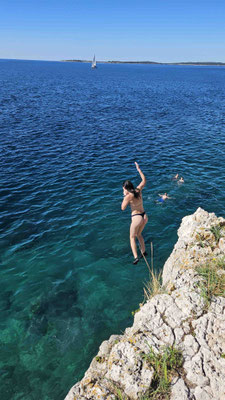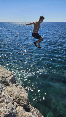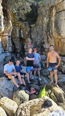 Das Highlight des Tages war ohne Zweifel das Klippenspringen. Wer den Mut hatte – oder wenigstens so tat – durfte mit Dennis hoch auf die Felsen steigen. Natürlich gab’s auch hier erst einmal eine Sicherheitsansprache, der alle sehr aufmerksam zuhörten, denn die Nerven begannen schon hier und da zu flattern.