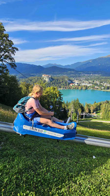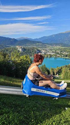 Oben angekommen ging es dann ans Eingemachte: 520 Meter Abfahrt auf der Sommerrodelbahn. Manche mit Vollgas, andere eher im Schneckentempo – Hauptsache heil unten angekommen. Kaum zu glauben, dass dieser Hang im Winter als Skipiste dient, aber offenbar lässt sich in Bled wirklich alles in Szene setzen.