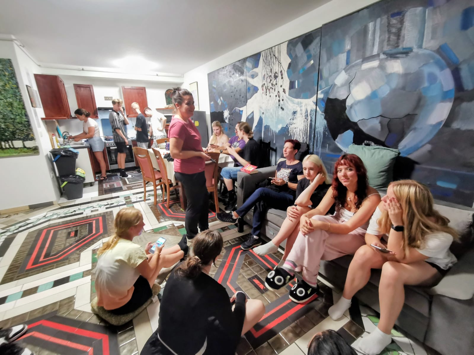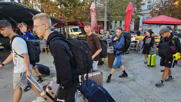 14.23 Uhr: Endlich Pula, direkt weiter mit unseren Marathon inklusive Rucksacktraining quer durch die Stadt bis zum Hostel. Dort angekommen hatte die Rezeption geschlossen. Kein Drama. Wir machten es uns in der Lobby gemütlich. Stühle gab’s tatsächlich, WLAN dagegen blieb ein Wunschtraum. Also hieß es: analog quatschen, bis um 16 Uhr endlich die Schlüsselübergabe stattfand. Untergebracht waren wir in großen Gemeinschaftssäle – die Jungs in ihrem Reich, die Mädchen natürlich separat, aber doch alle unter einem Dach. Klingt praktisch? Naja, eher nach einer Herausforderung der besonderen Art: Kofferchaos als Bodenbelag und die tägliche Suche nach der eigenen Socke.