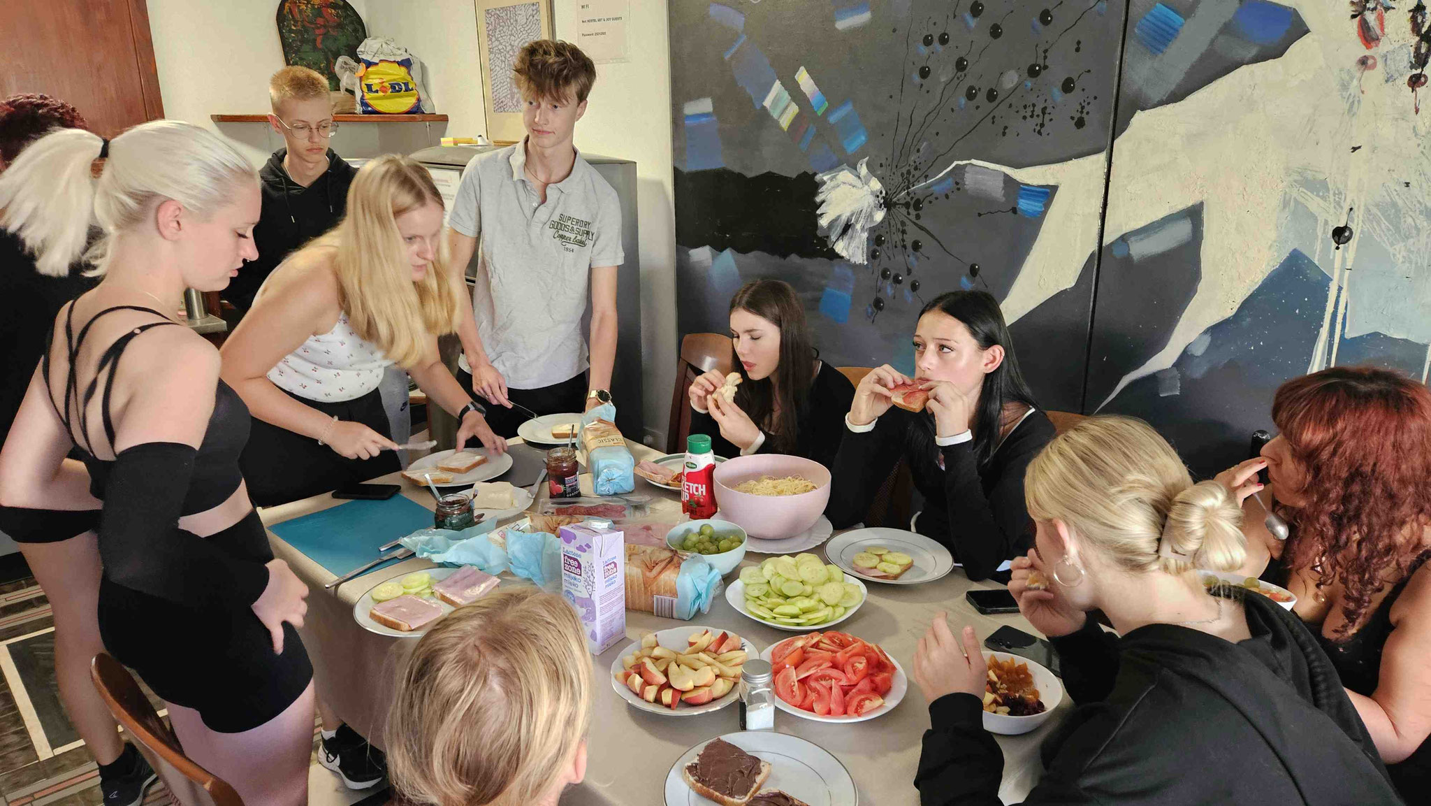 Die wahren Heldinnen des Tages waren zwei Schülerinnen, die sich um 7.00 Uhr aus den Betten gequält haben, um für alle einzukaufen und Frühstück vorzubereiten. Der Rest der Gruppe tat das einzig Sinnvolle: weiterschlafen. Gegen 8.45 Uhr wurde dann gemeinsam gefrühstückt. Was da auf dem Tisch stand, hätte jeder Hostel-Küche die Tränen in die Augen getrieben: Obst, Gemüse, Müsli, Trockenfrüchte, süßer und herzhafter Belag – und natürlich das beste Toastbrot der Welt ;)