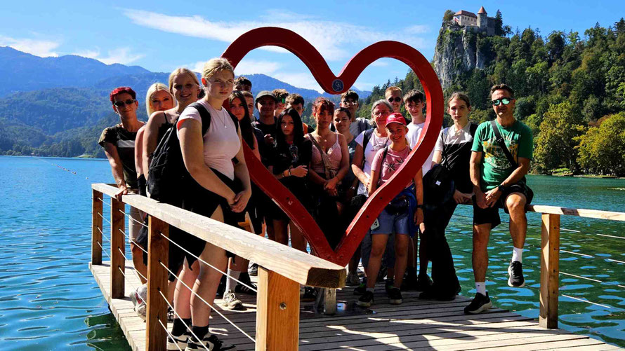 Nach der Klamm blieb uns kurz ein bisschen Freizeit, bevor wir uns am wohl kitschigsten Fotospot Bleds – dem roten Herz am See – wieder trafen. Dort wurde natürlich das zweite unverzichtbare Gruppenfoto geknipst (Nummer eins war ja schon in der Klamm, man will ja nichts verpassen).