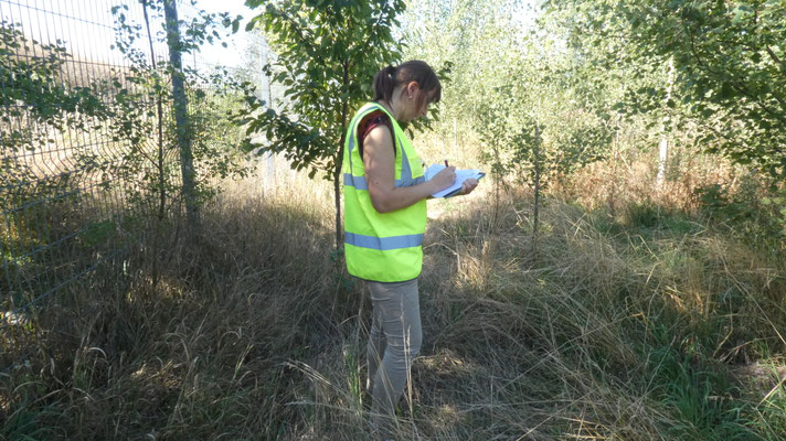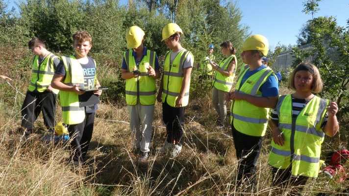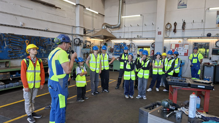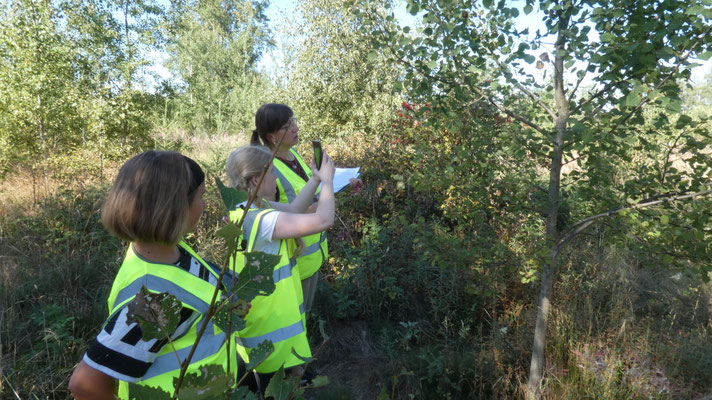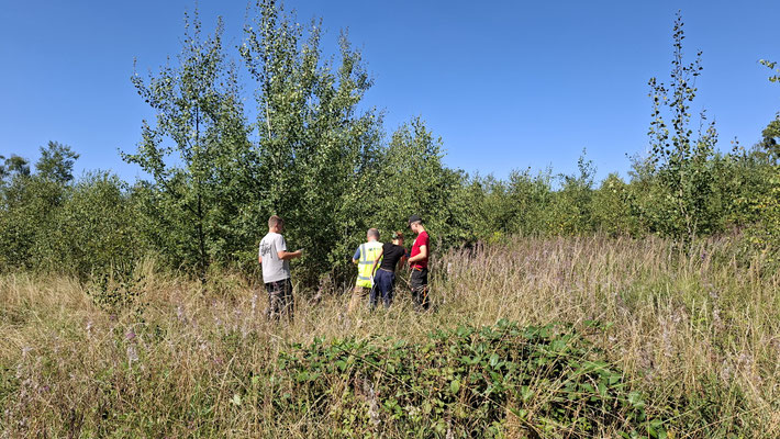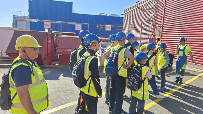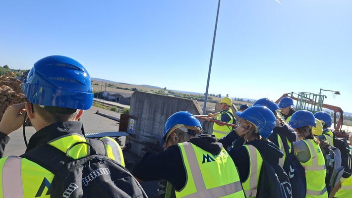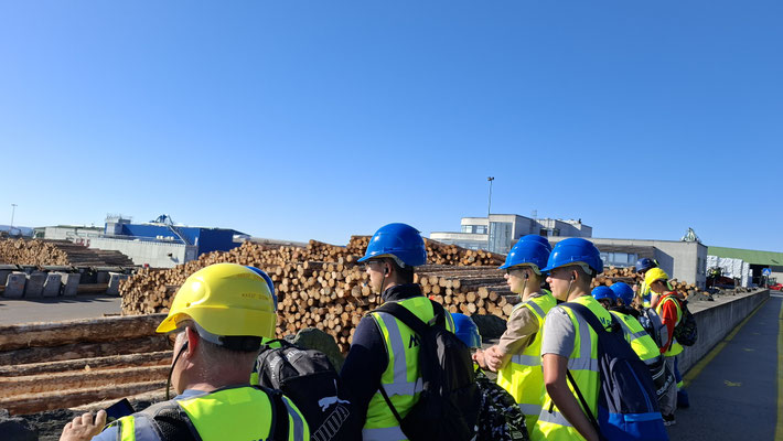 In 2 Gruppen aufgeteilt ging es für einen Teil zunächst direkt auf die Pflanzfläche. Da die Bäume innerhalb der 3 Jahre ordentlich an Größe dazugewonnen haben und erfreulicher Weise auch viel Anflug hinzukam, musste zunächst der Pflanzbereich geortet werden. Die verschiedenen Baumarten wurden ermittelt, gezählt, fotografiert und fachmännisch vermessen. Hilfreich waren dabei auch entsprechende Pflanzenbestimmungs-Apps. Der andere Teil der Gruppe wurde von Herrn Marco Wachter, dem Ausbildungsverantwortlichen des Standortes, durch das Werk geführt, um die verschiedenen Arbeitsschritte der Holzverarbeitung direkt vor Ort kennenzulernen. Dabei wurde der Fokus besonders auf mögliche Berufsfelder und Ausbildungsmöglichkeiten des Unternehmens gelegt, um den Schülern Impulse für ihre Berufsorientierung zu geben. Nach einer leckeren Stärkung in der Kantine und einem gemeinsamen Gruppenbild haben die beiden Gruppen getauscht. Im Anschluss an diesen sehr interessanten gemeinsamen Tag wurden die gesammelten Erfahrungen und die gewonnen Erkenntnisse ausgetauscht.